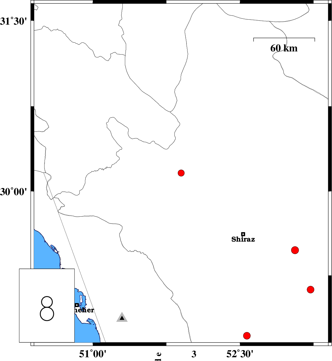 | 2006/07/03 | 03:29:44.3 | 06:59:44.3 | 29.39 | 51.41 | 15 | ML:3.3 | 24 km North-East of Borazjan, Bushehr Province |