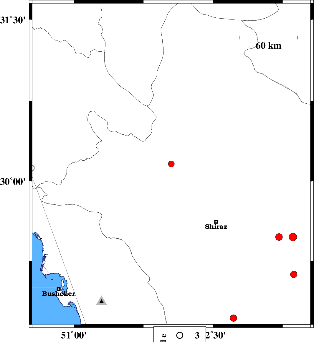 | 2006/06/29 | 18:41:31.8 | 22:11:31.8 | 29.02 | 51.36 | 18 | ML:3.5 | 18 km North-East of Ahram, Bushehr Province |