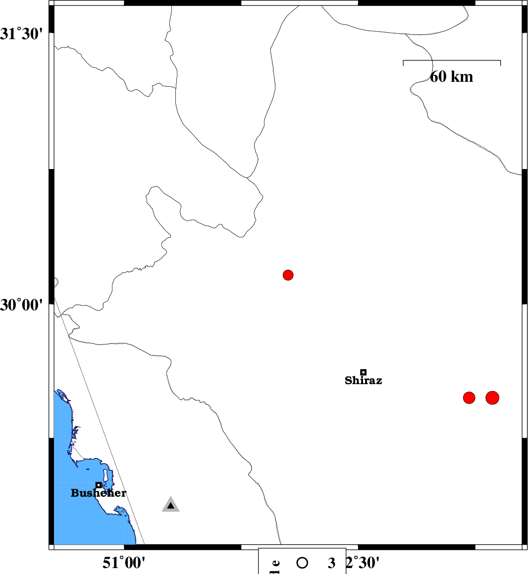 | 2006/07/08 | 00:04:32.6 | 03:34:32.6 | 28.83 | 51.76 | 25 | ML:3.6 | 31 km West of Farashband, Fars Province |