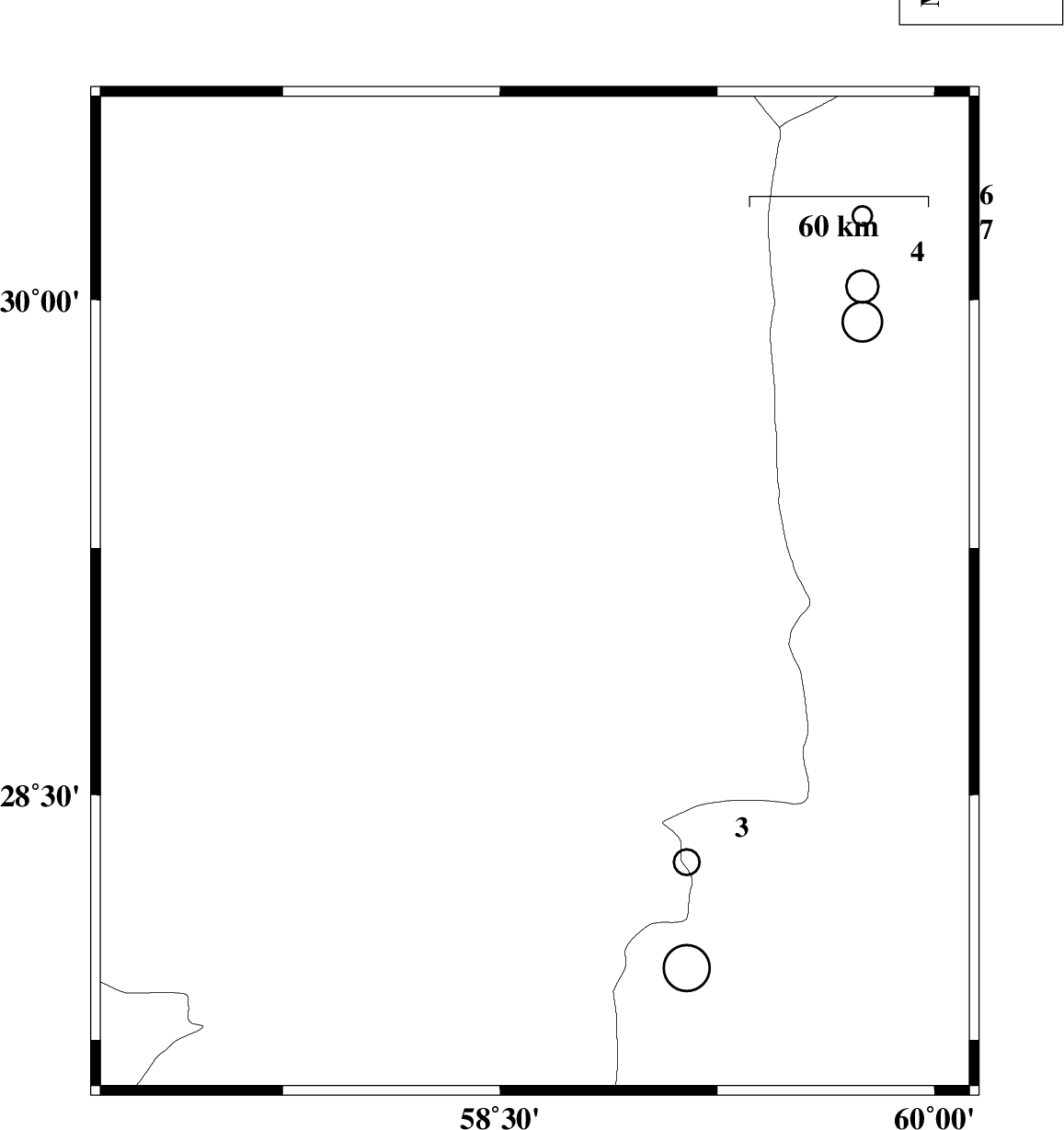 | 2006/07/13 | 11:23:16.3 | 14:53:16.3 | 29.11 | 58.62 | 17 | ML:2.7 | 25 km East of Bam, Kerman Province | ||