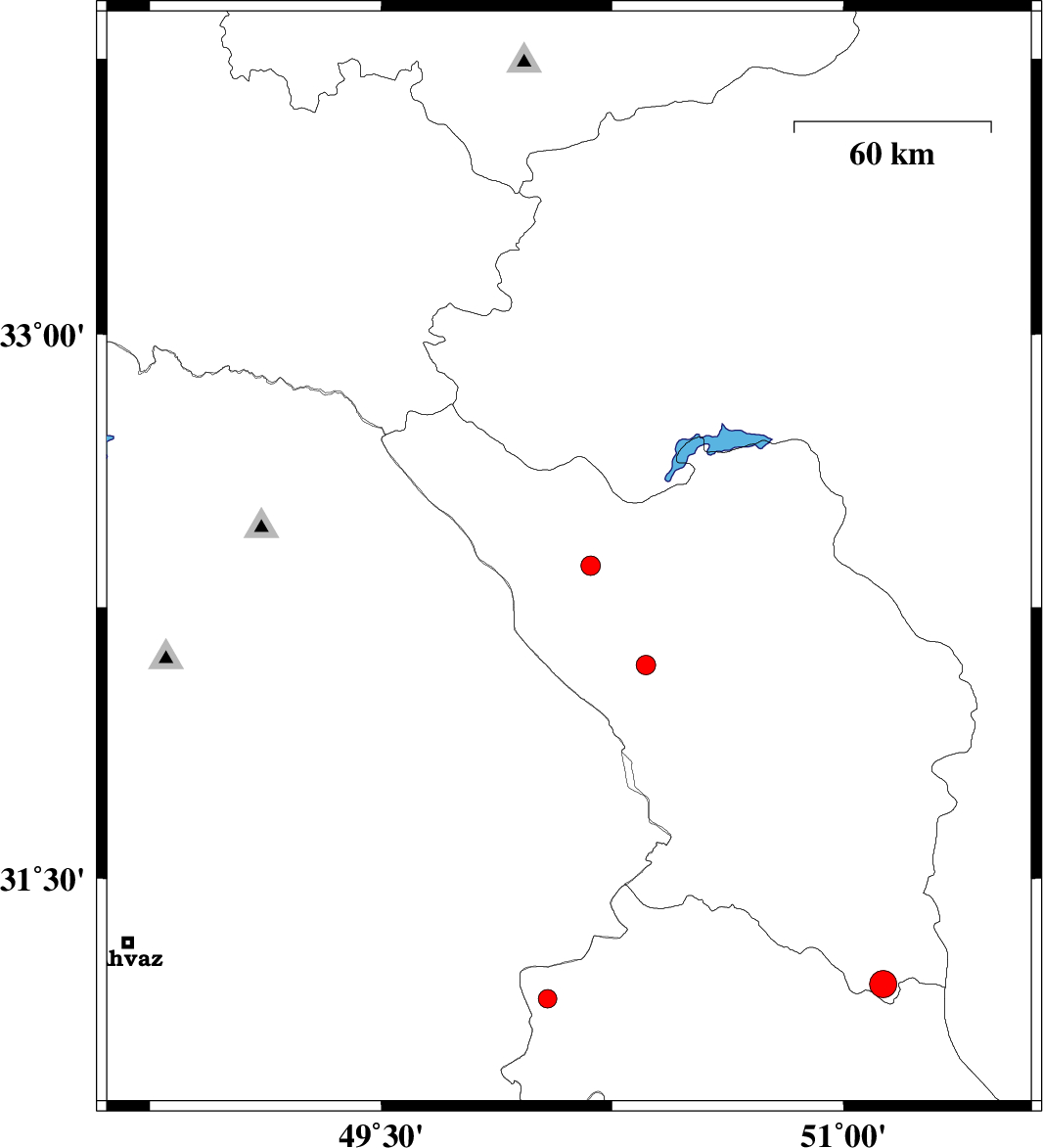 | 2006/08/14 | 11:51:11.2 | 15:21:11.2 | 33.59 | 49.05 | 14 | ML:2.8 | 11 km North of Dorud, Lorestan Province | ||