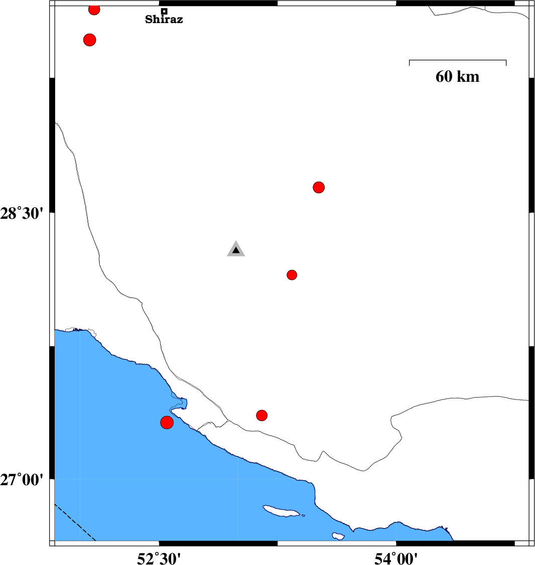 | 2006/07/19 | 08:24:19.2 | 11:54:19.2 | 27.32 | 52.55 | 15 | ML:3.6 | Persian Gulf, 42 km South-West of Mehr |