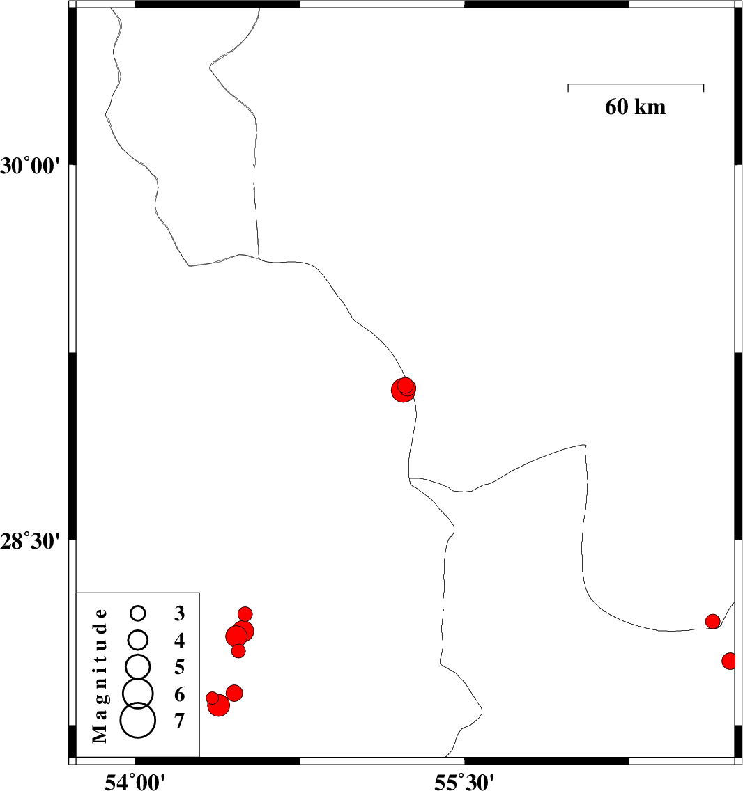 2006/06/23 09:08:53.3 12:38:53.3 28.254.515 ML:3 59 km North-East of Lar, Fars Province