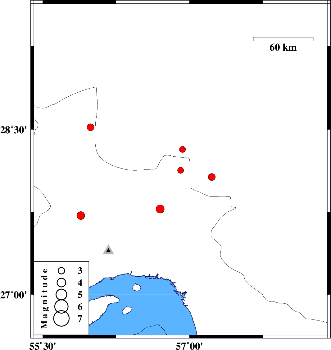 | 2006/07/25 | 21:51:42.9 | 01:21:42.9 | 27.78 | 56.7 | 14 | ML:3.8 | 66 km North-West of Dehbarez, Hormozgan Province | ||