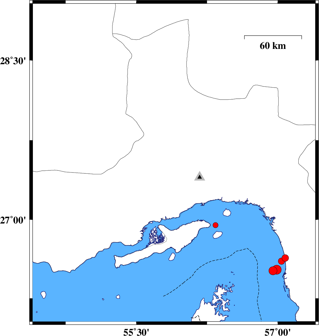 | 2006/08/23 | 17:18:04.9 | 20:48:04.9 | 27.56 | 55.94 | 14 | ML:3.3 | 53 km North-West of Bandar-e abbas, Hormozgan Province | ||