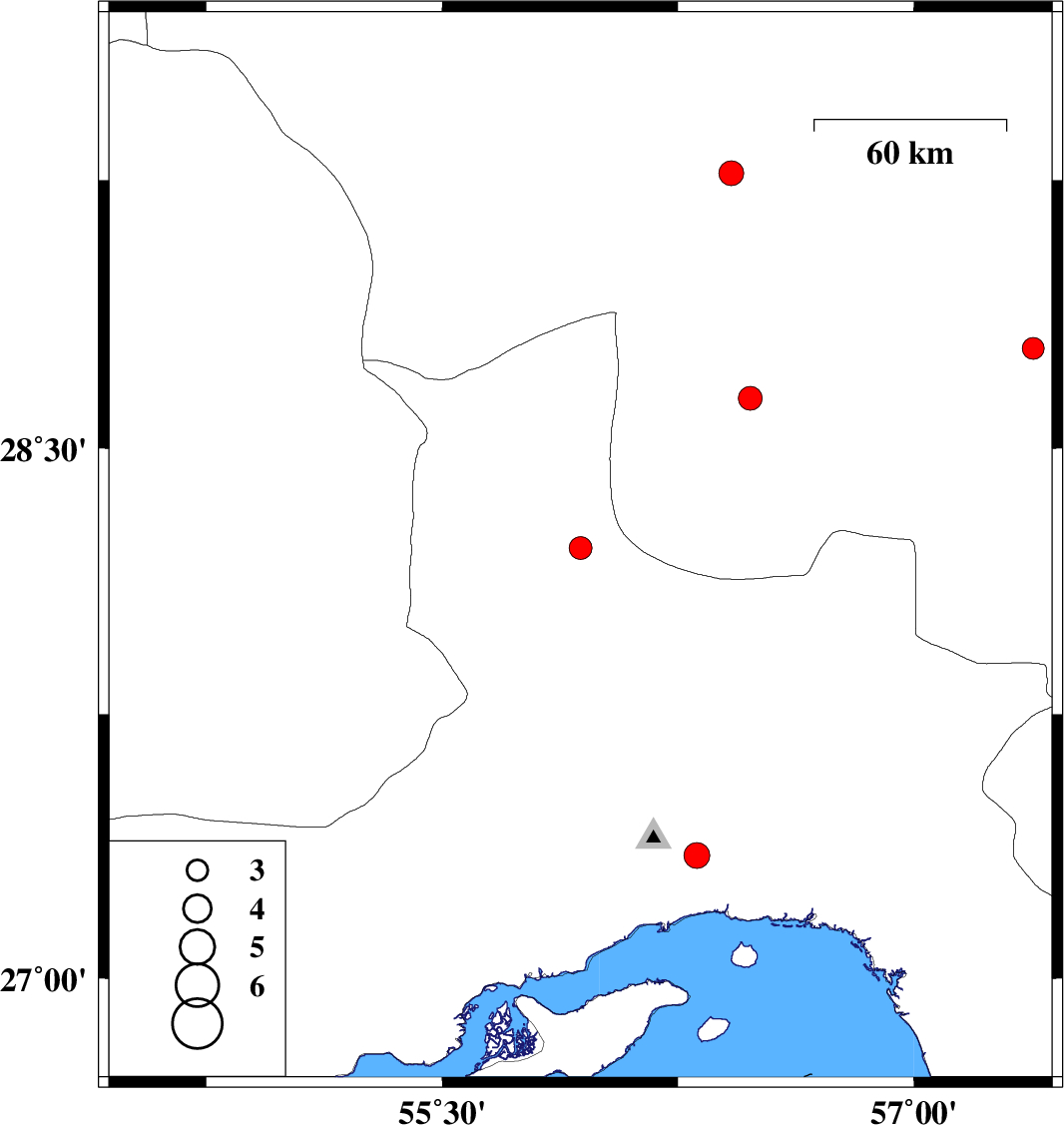 | 2006/09/25 | 04:32:46.4 | 08:02:46.4 | 28.22 | 55.94 | 15 | ML:3.2 | 10 km Hajiabad, Hormozgan Province | ||