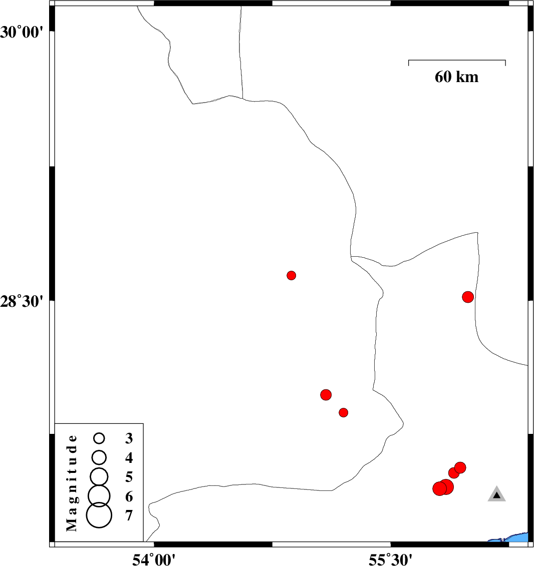 | 2006/07/29 | 18:55:49.2 | 22:25:49.2 | 27.97 | 55.09 | 15 | ML:3.1 | 80 km North-East of Lar, Fars Province |