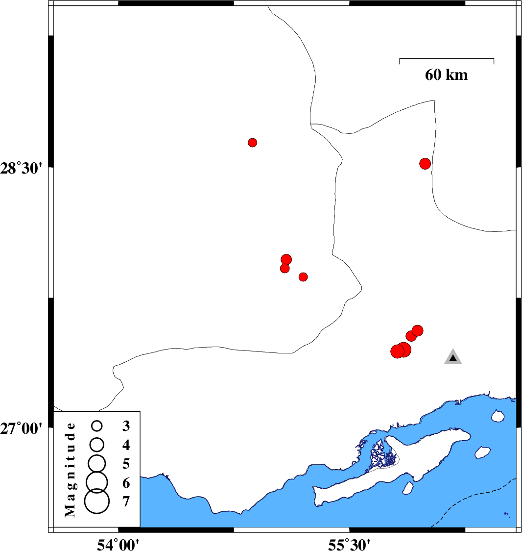 | 2006/07/29 | 18:55:49.2 | 22:25:49.2 | 27.97 | 55.09 | 15 | ML:3.1 | 80 km North-East of Lar, Fars Province |
