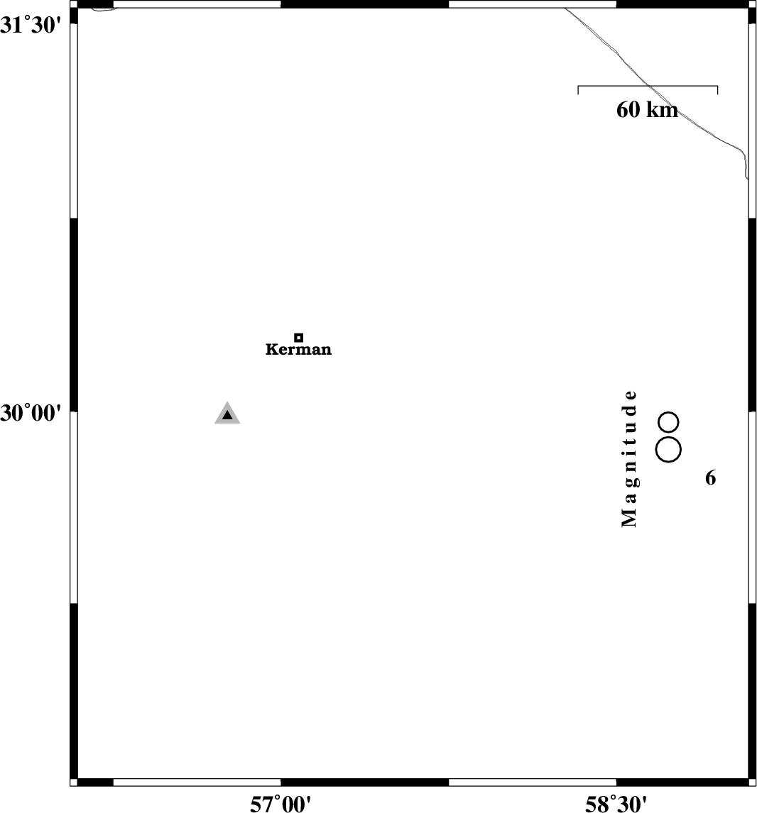 | 2006/10/04 | 13:39:40.6 | 17:09:40.6 | 30.06 | 57.59 | 14 | ML:2.9 | 55 km South-East of Kerman, Kerman Province |