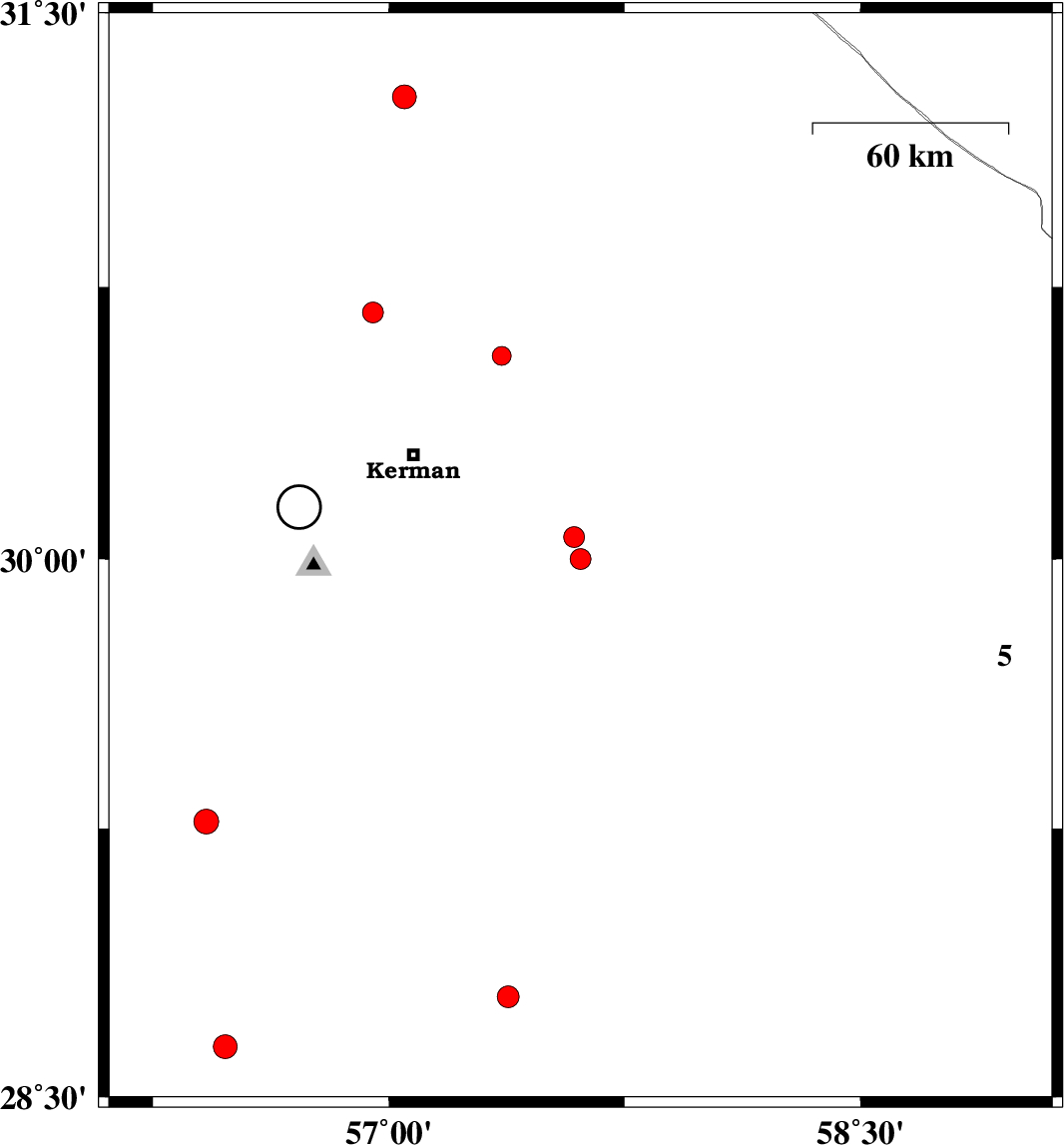 | 2006/10/07 | 11:23:04.7 | 14:53:04.7 | 30 | 57.61 | 15 | ML:2.9 | 60 km South-East of Kerman, Kerman Province | ||