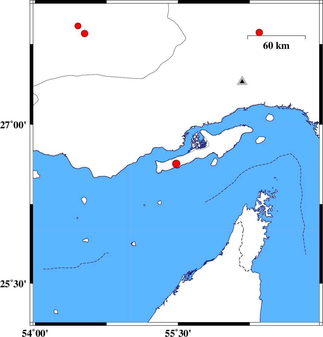 | 2006/10/22 | 04:55:14.5 | 08:25:14.5 | 26.63 | 55.48 | 18 | ML:3.7 | Persian Gulf, 63 km North-East of Bandar-e lengeh | ||