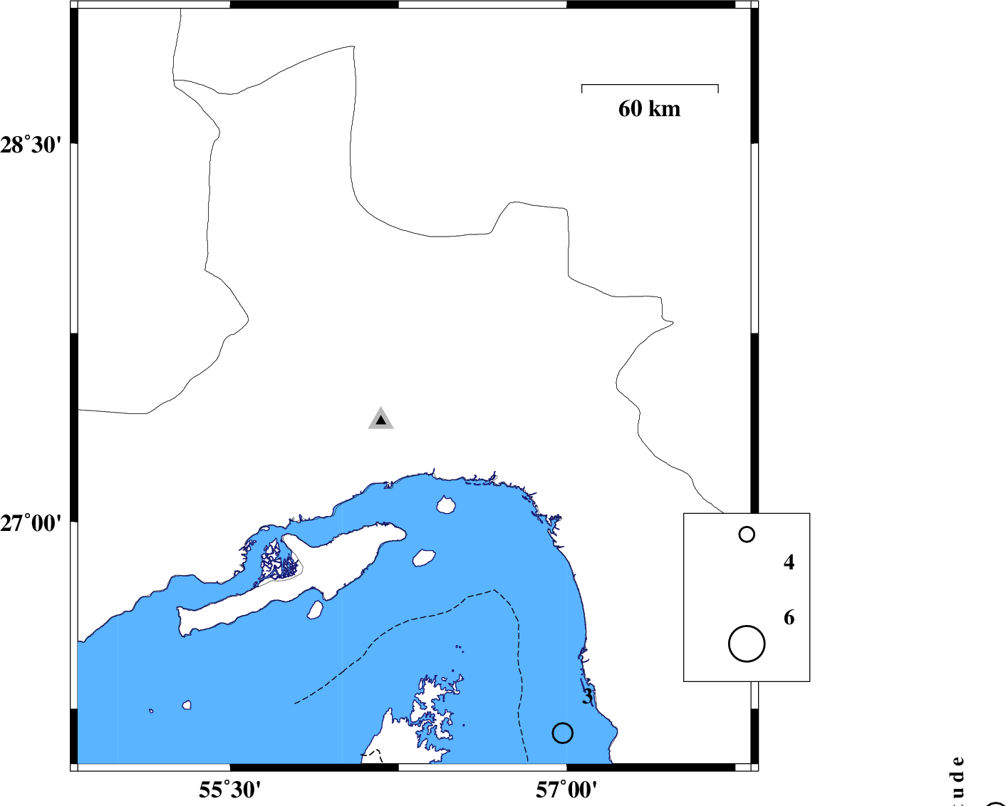 | 2006/10/30 | 02:23:54.8 | 05:53:54.8 | 27.53 | 56.32 | 26 | ML:3.2 | 38 km North of Bandar-e abbas, Hormozgan Province | ||