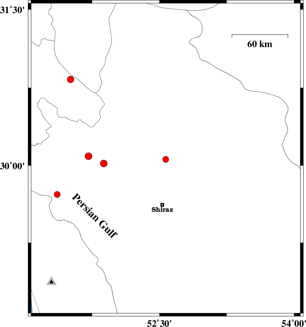 | 2006/10/11 | 21:01:45.8 | 00:31:45.8 | 29.72 | 51.36 | 15 | ML:3.1 | 30 km West of Kazerun, Fars Province |