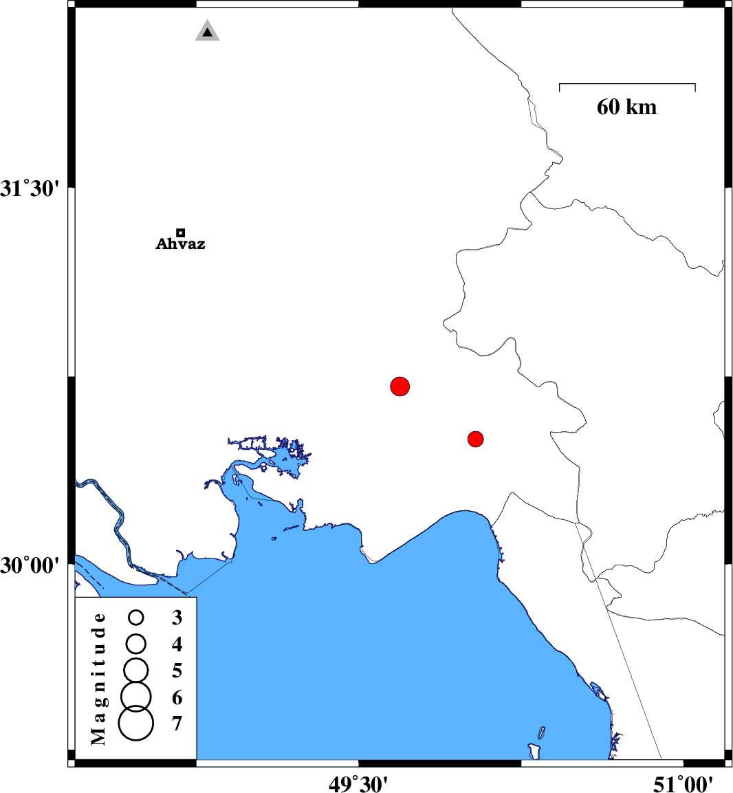 | 2006/11/03 | 00:29:19.3 | 03:59:19.3 | 30.71 | 49.69 | 37 | ML:3.9 | 6 km Omidiyeh, Khoozestan Province | ||