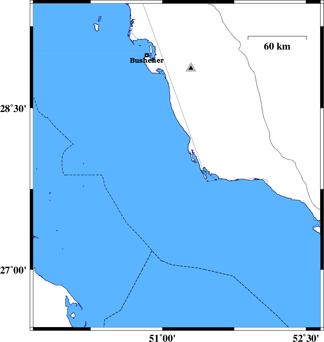| 2006/11/03 | 07:54:08.3 | 11:24:08.3 | 27.96 | 51.15 | 39 | ML:4.3 | Persian Gulf, 79 km South-West of Khormog |