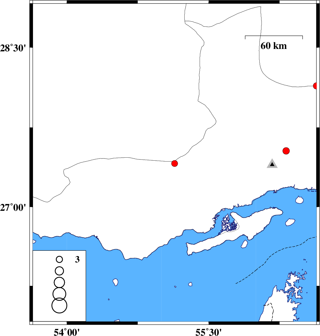 | 2006/10/30 | 02:23:54.8 | 05:53:54.8 | 27.53 | 56.32 | 26 | ML:3.2 | 38 km North of Bandar-e abbas, Hormozgan Province | ||