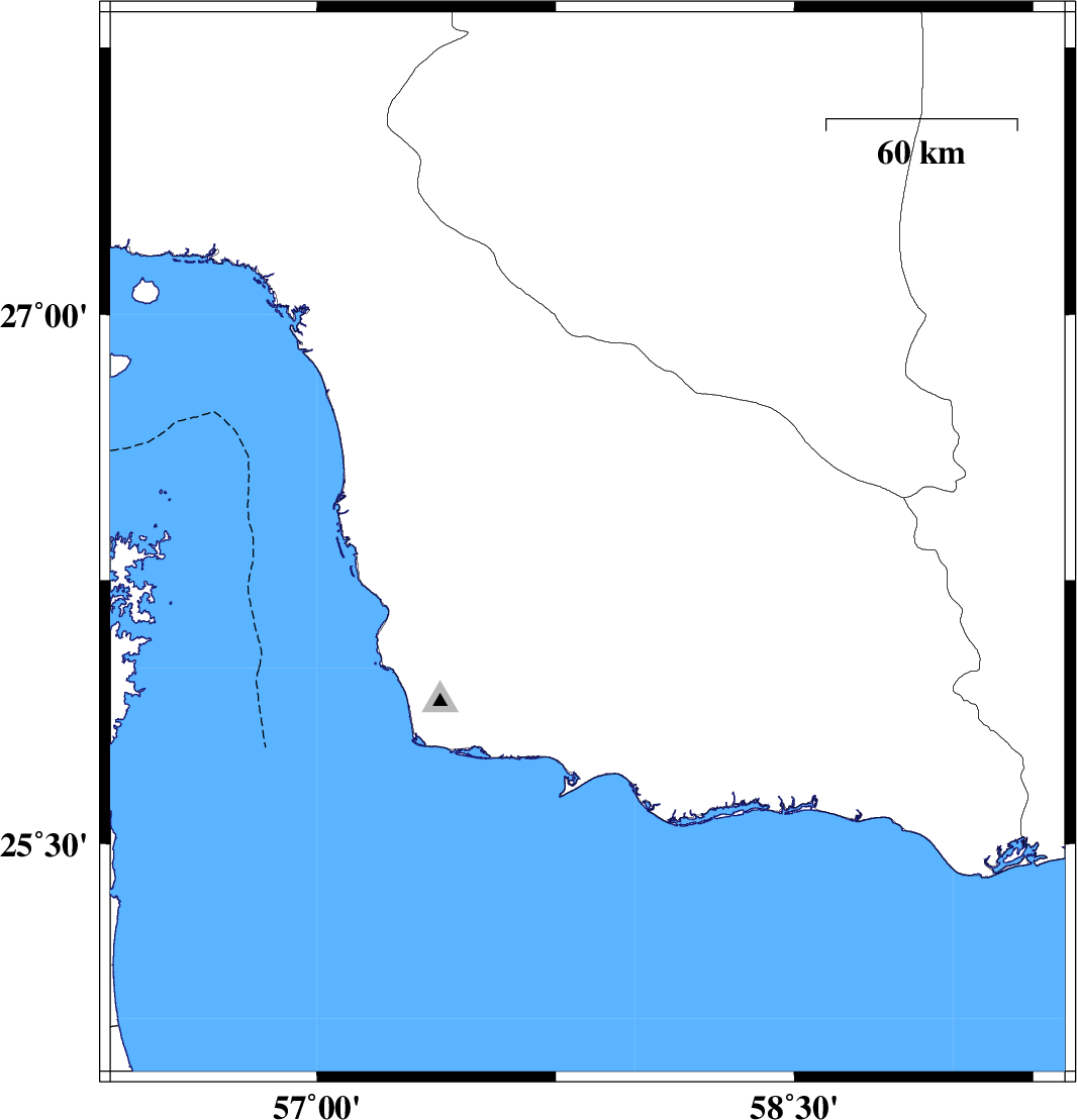 | 2006/11/16 | 11:22:43.6 | 14:52:43.6 | 26.35 | 57.85 | 14 | ML:3.9 | 80 km North of Jask, Hormozgan Province | ||