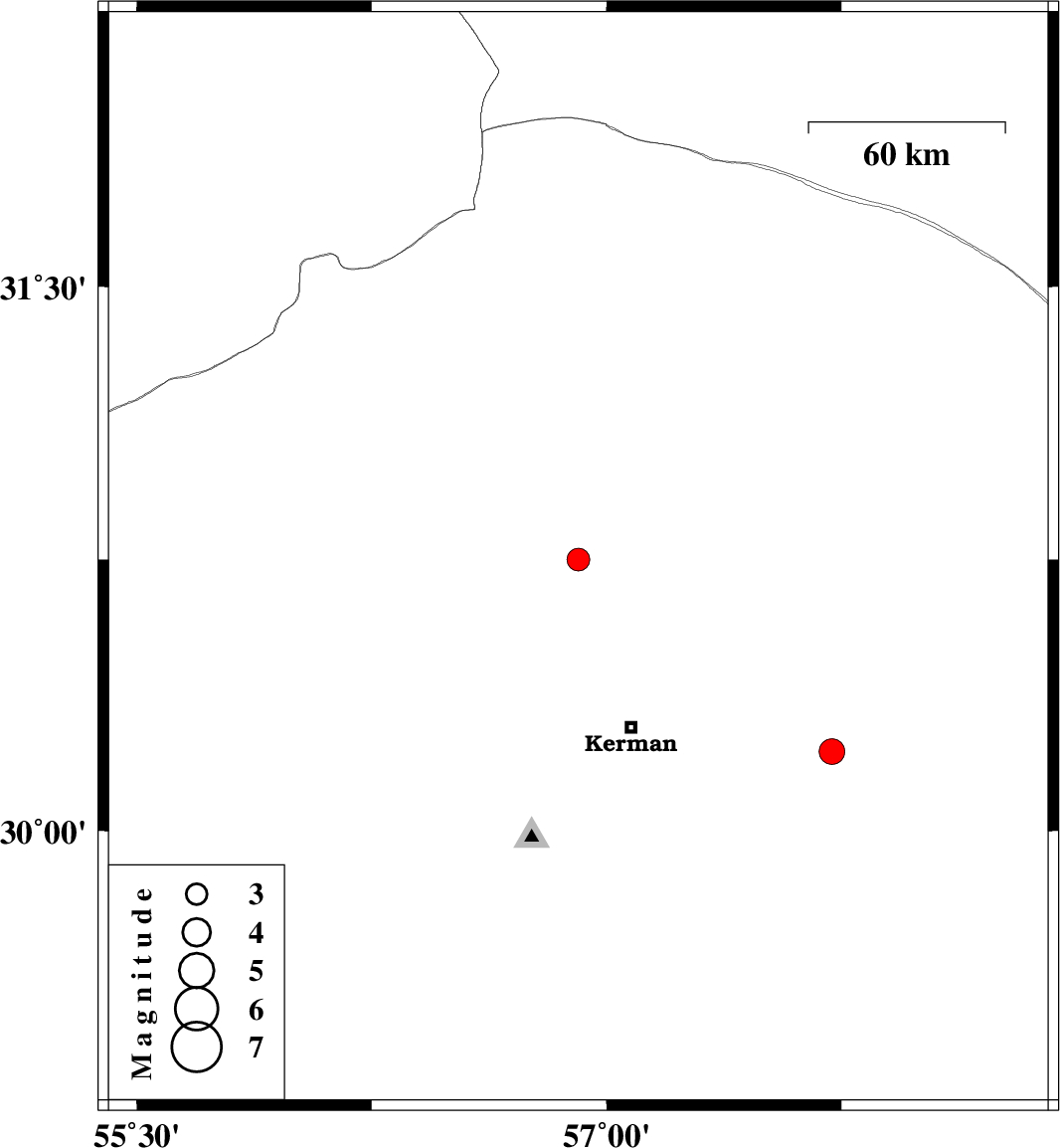 | 2006/11/17 | 18:06:50.5 | 21:36:50.5 | 30.22 | 57.72 | 14 | ML:3.6 | 62 km East of Kerman, Kerman Province |