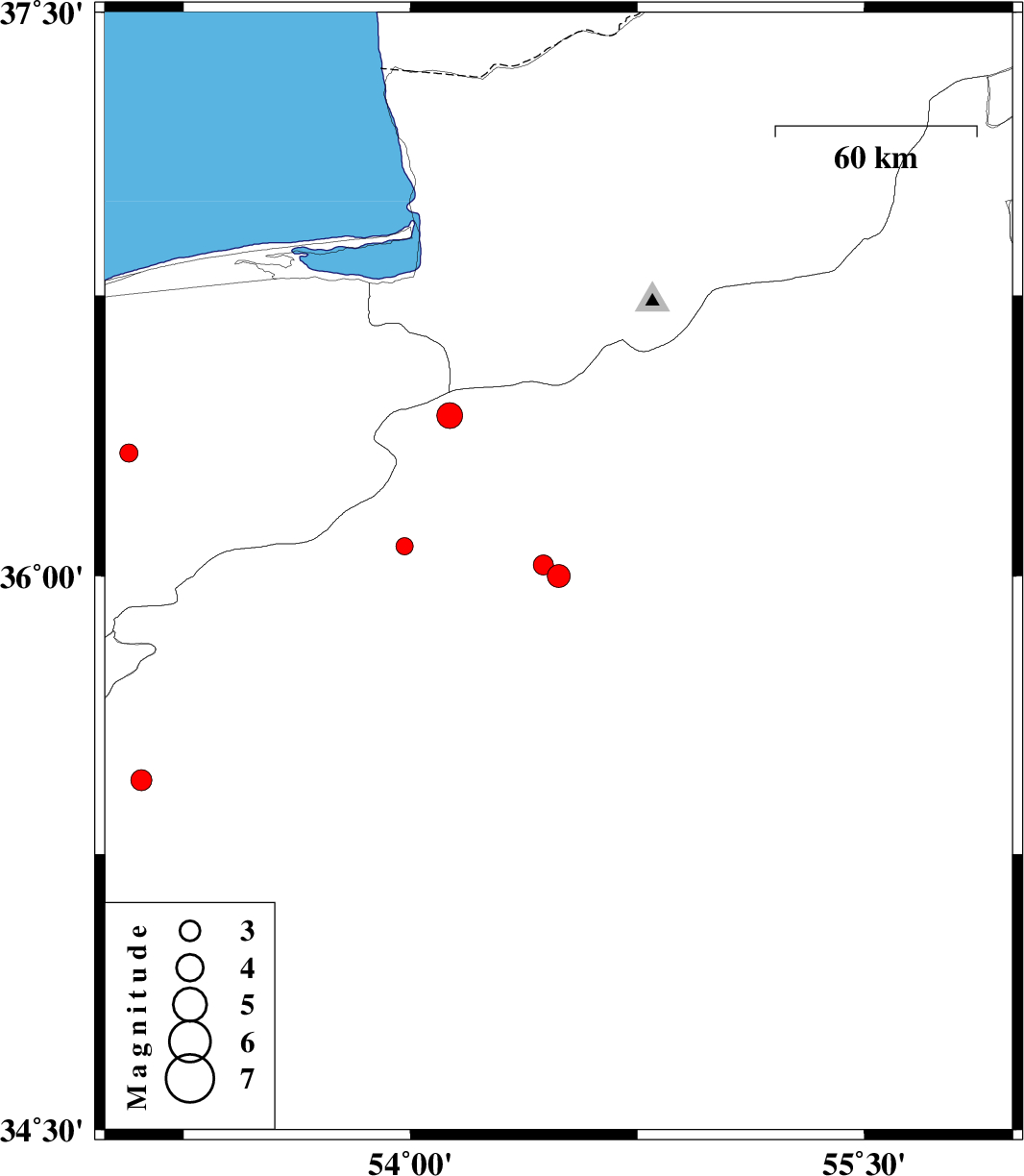 | 2006/11/12 | 17:22:01.8 | 20:52:01.8 | 36.03 | 54.44 | 14 | ML:3 | 17 km South of Damghan, Semnan Province |