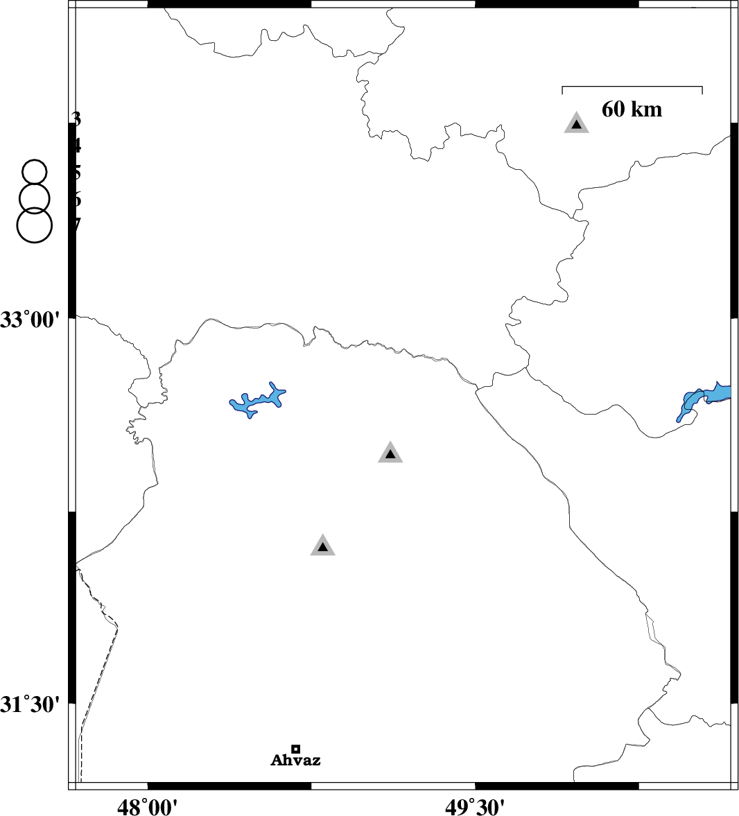 | 2006/11/07 | 08:52:21.4 | 12:22:21.4 | 31.91 | 49.19 | 16 | ML:4 | 11 km West of Masjed Soleyman, Khoozestan Province | ||