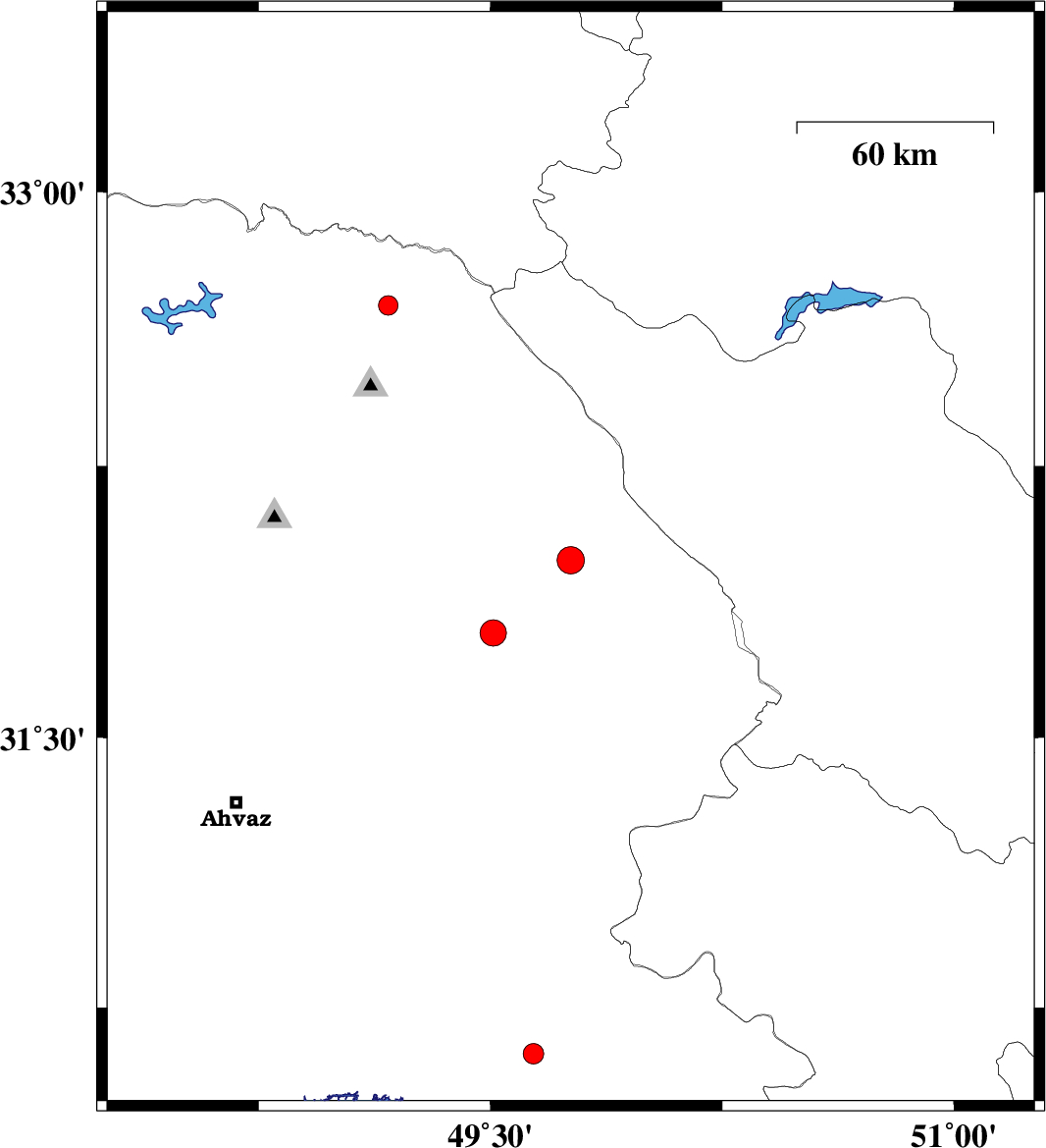 | 2006/11/24 | 18:21:31.2 | 21:51:31.2 | 30.62 | 49.64 | 32 | ML:3 | 16 km South of Omidiyeh, Khoozestan Province | ||