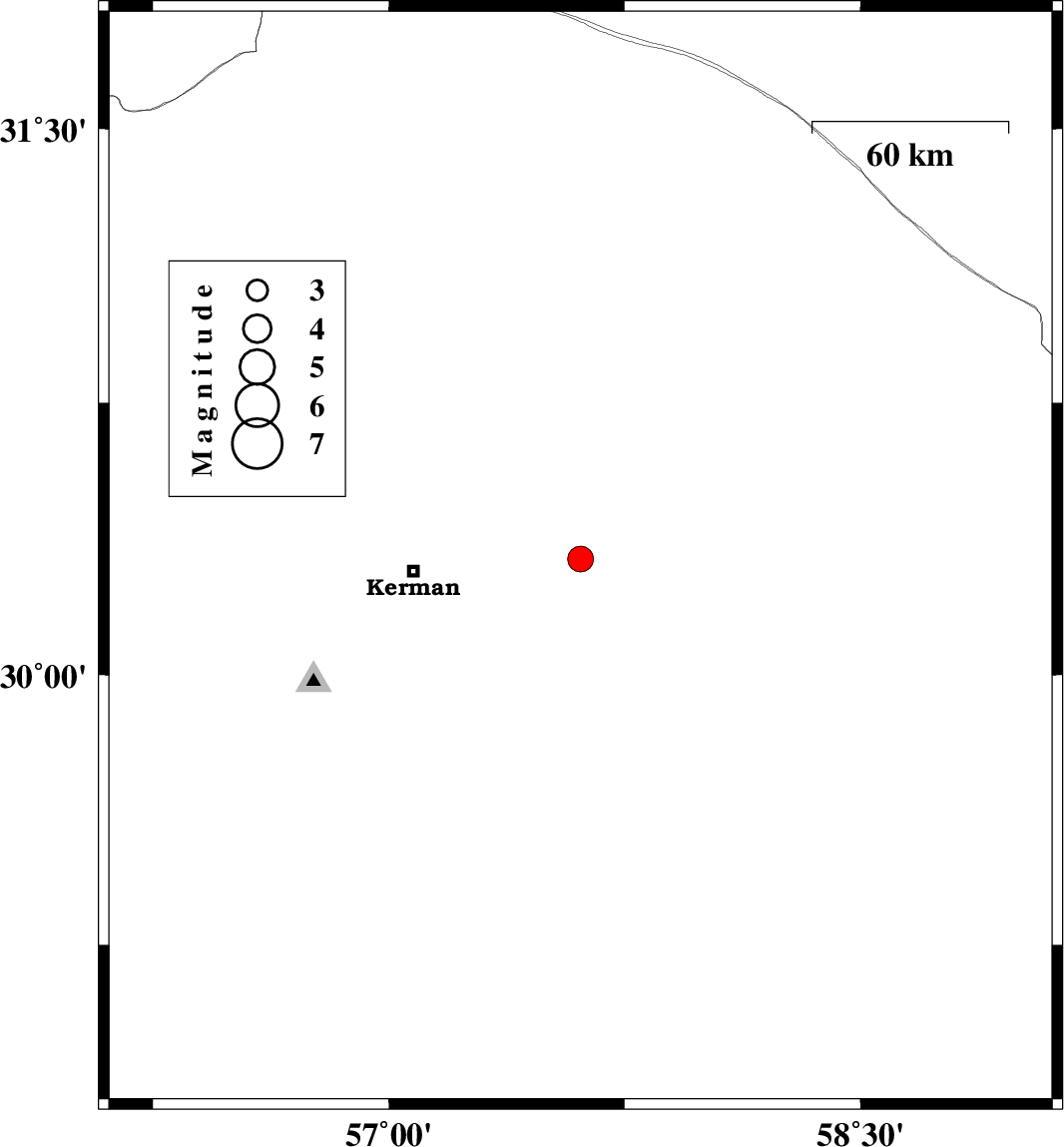 | 2006/12/11 | 00:09:06.1 | 03:39:06.1 | 30.32 | 57.61 | 15 | ML:3.6 | 50 km East of Kerman, Kerman Province | ||