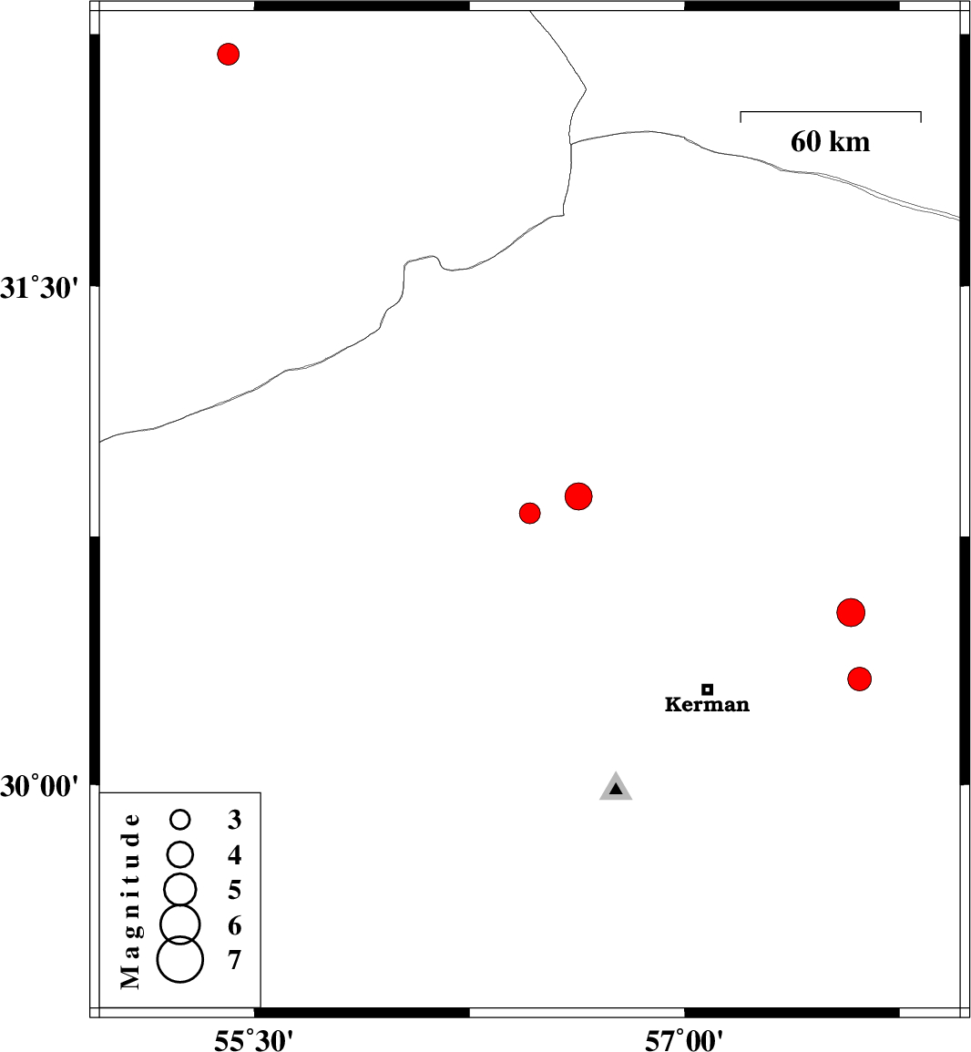 | 2006/12/11 | 00:09:06.1 | 03:39:06.1 | 30.32 | 57.61 | 15 | ML:3.6 | 50 km East of Kerman, Kerman Province | ||