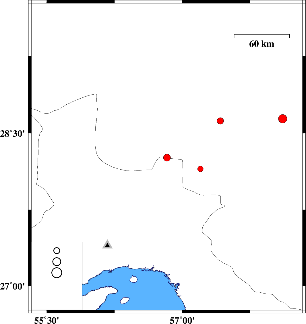 | 2006/12/15 | 15:00:49.2 | 18:30:49.2 | 28.15 | 57.2 | 18 | ML:2.8 | 53 km North-West of Kahnuj, Kerman Province | ||