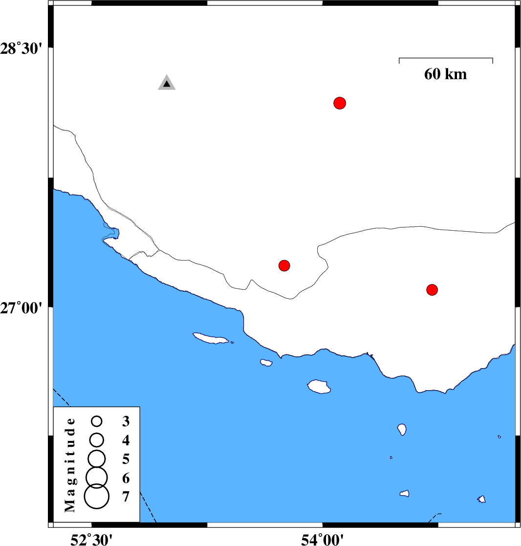 | 2006/12/15 | 22:48:05.0 | 02:18:05.0 | 27.1 | 54.71 | 40 | ML:3.2 | 35 km South-East of Bastak, Hormozgan Province | ||