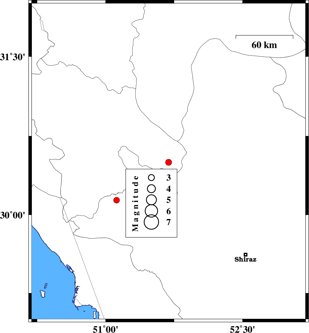 | 2007/01/12 | 02:30:37.9 | 06:00:37.9 | 30.21 | 51.75 | 14 | ML:3.1 | 23 km West of Ardakan, Fars Province |