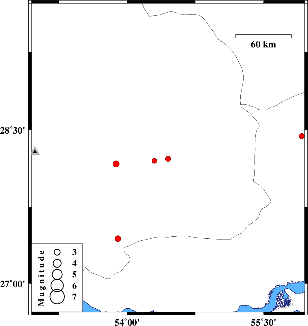 | 2006/12/31 | 21:29:14.3 | 00:59:14.3 | 27.44 | 53.9 | 14 | ML:2.9 | 50 km South-West of Lar, Fars Province |