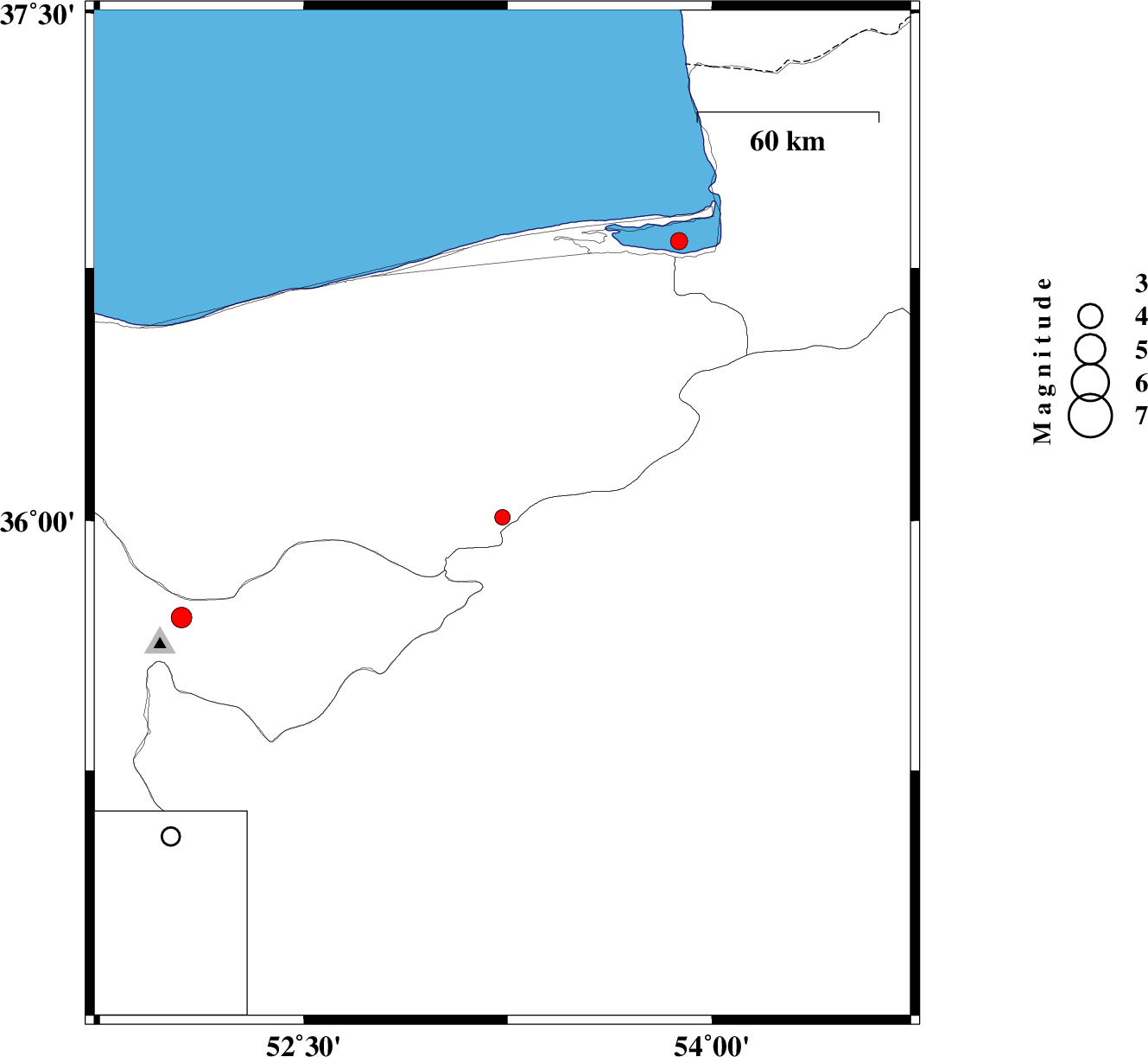 | 2007/02/22 | 08:50:43.4 | 12:20:43.4 | 36.83 | 53.88 | 14 | ML:2.8 | Caspian Sea, 9 km Bandar-e gaz |