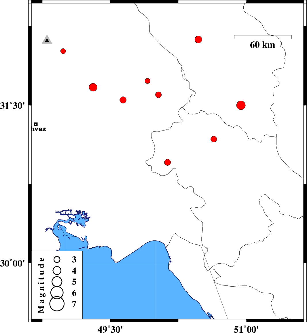 | 2007/03/06 | 05:53:59.6 | 09:23:59.6 | 31.6 | 50.03 | 25 | ML:2.9 | 15 km East of Bagh Malek, Khoozestan Province | ||