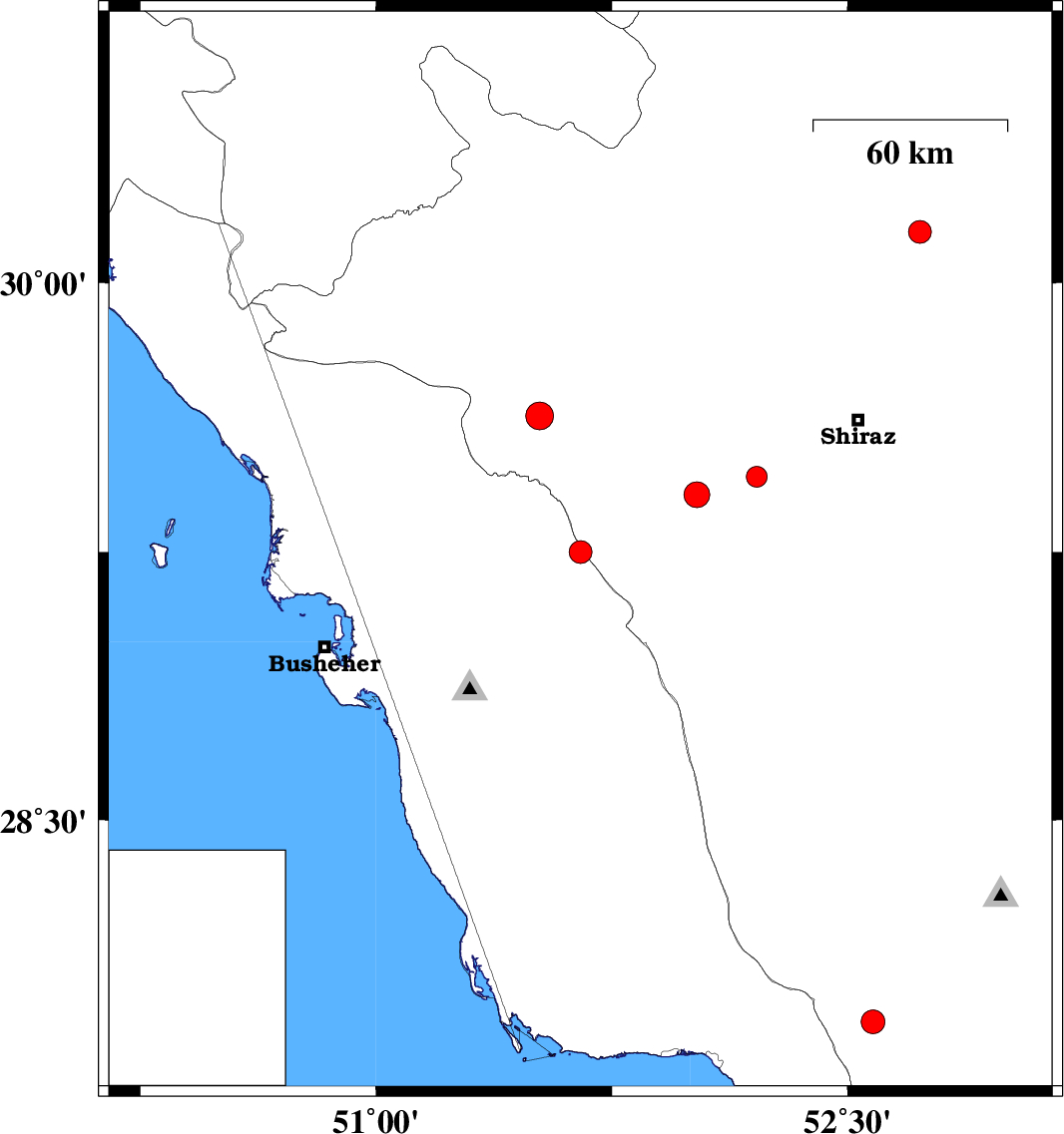 | 2007/04/17 | 12:20:39.4 | 15:50:39.4 | 29.46 | 52.21 | 18 | ML:3 | 35 km South-West of Shiraz, Fars Province |