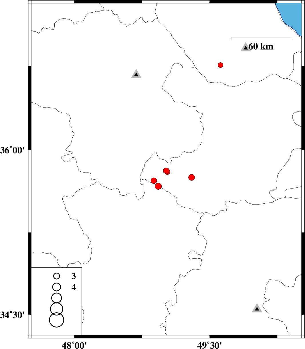 | 2007/04/15 | 04:24:21.0 | 07:54:21.0 | 35.67 | 48.93 | 14 | ML:3.2 | 33 km North-West of Razan, Hamedan Province |