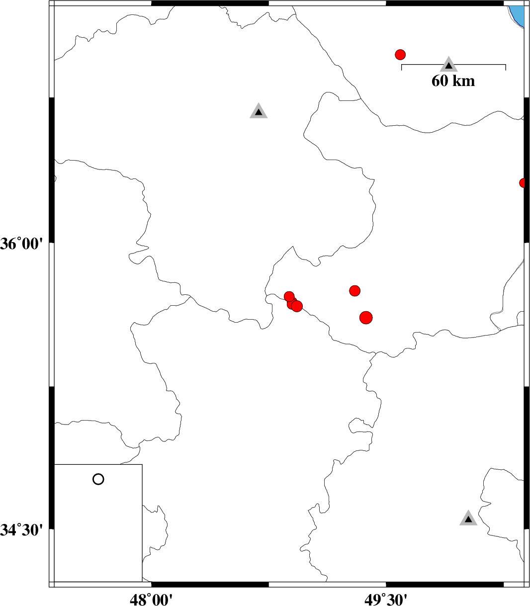 | 2007/04/02 | 15:53:16.6 | 19:23:16.6 | 35.69 | 48.9 | 14 | ML:2.9 | 36 km North-West of Razan, Hamedan Province | ||