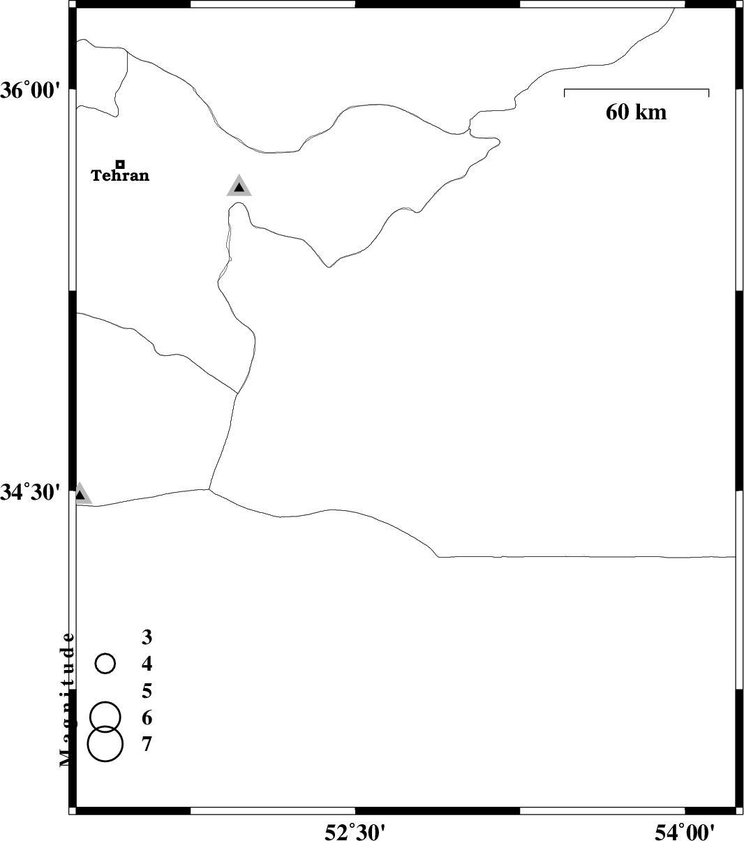 | 2007/06/19 | 07:58:29.4 | 11:28:29.4 | 34.8 | 52.73 | 14 | ML:2.7 | 58 km South-East of Garmsar, Semnan Province | ||