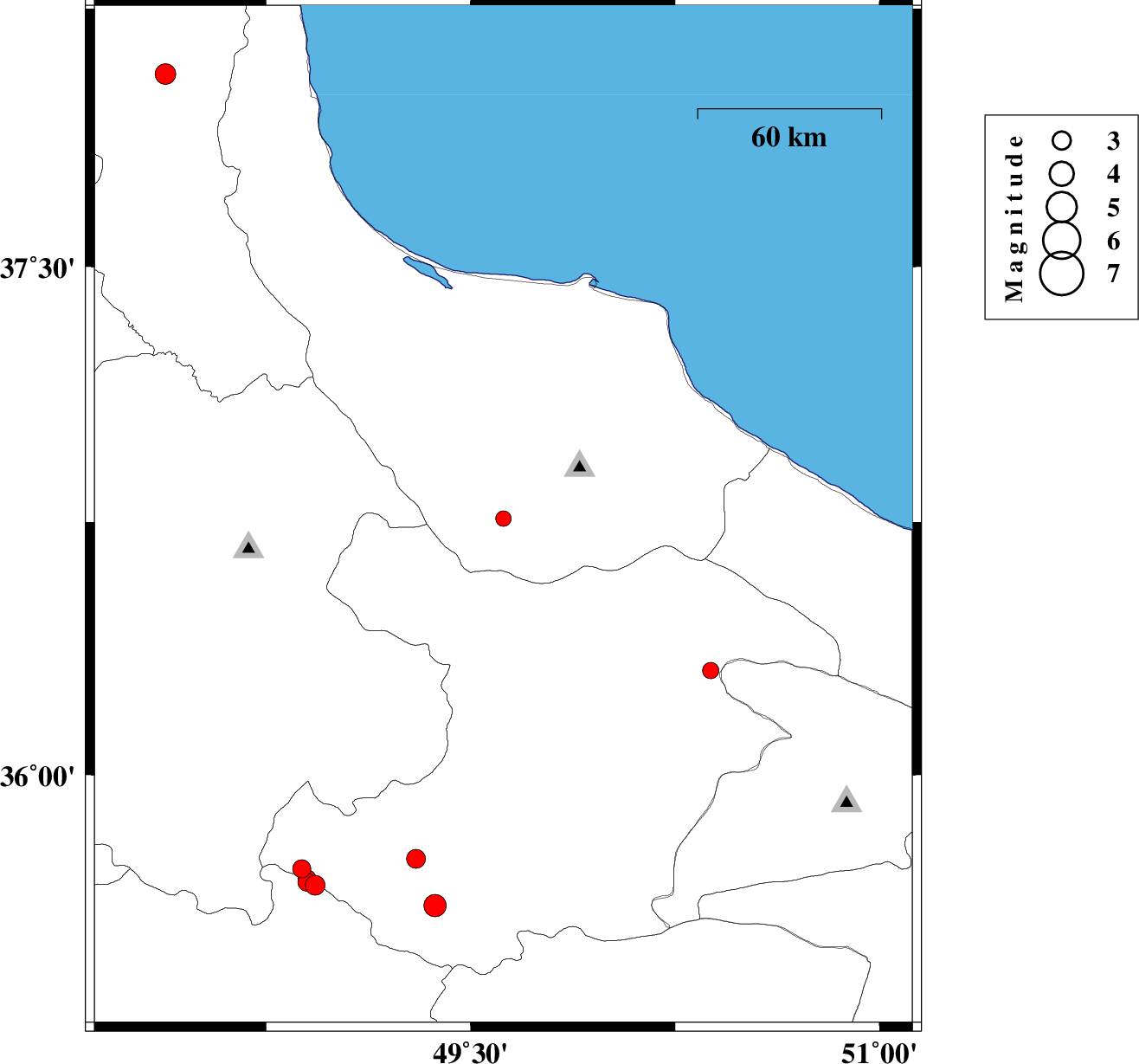 | 2007/04/21 | 08:47:31.8 | 12:17:31.8 | 36.76 | 49.62 | 14 | ML:2.6 | 18 km East of Rudbar, Gilan Province | ||