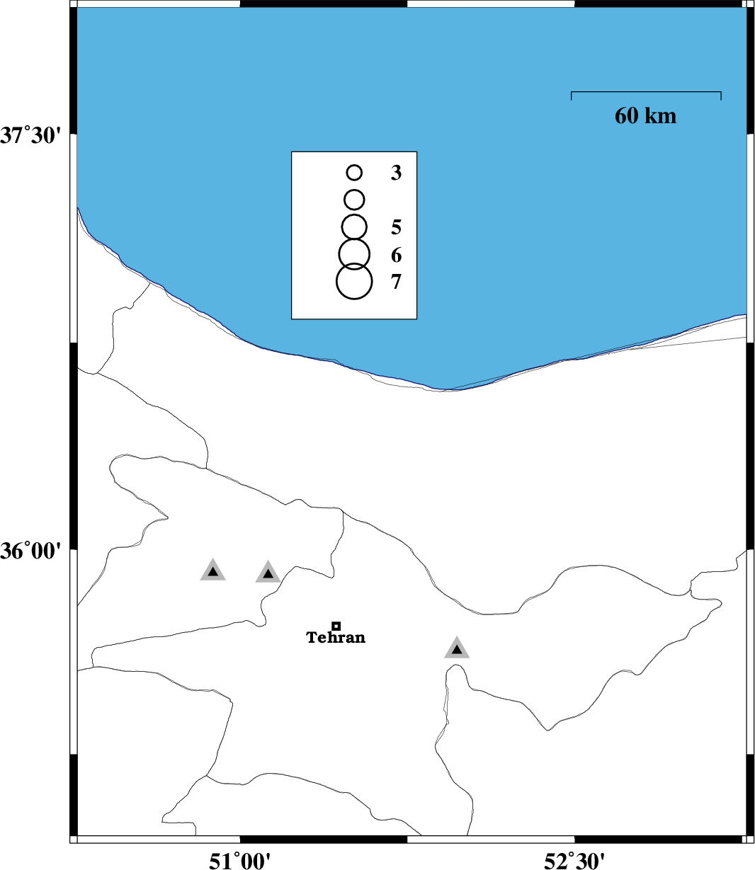 | 2007/05/23 | 01:39:37.4 | 05:09:37.4 | 36.45 | 51.77 | 14 | ML:2.6 | 27 km South-West of Nur, Mazandaran Province |