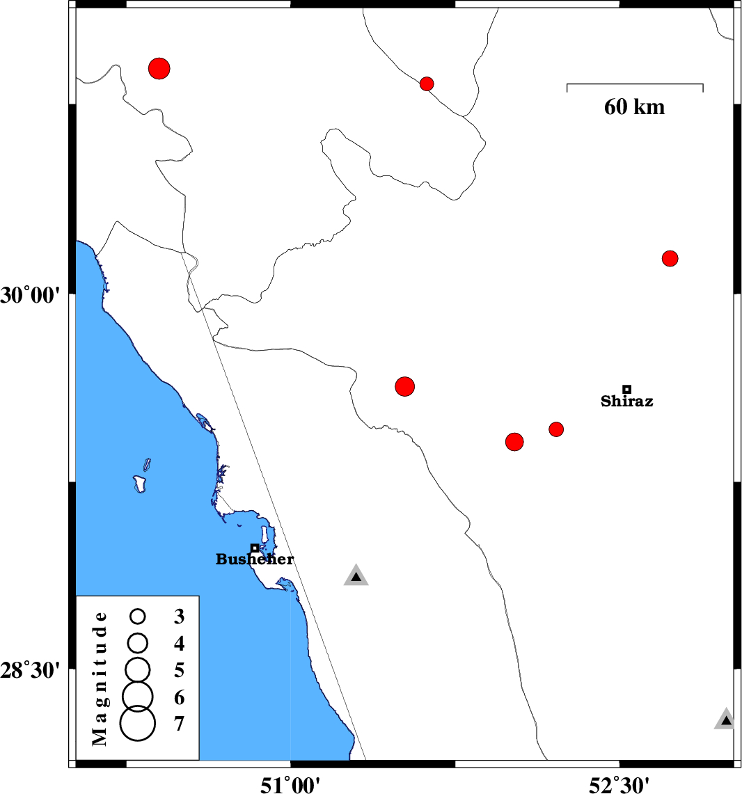 | 2007/04/23 | 12:12:04.1 | 15:42:04.1 | 29.41 | 52.02 | 14 | ML:3.6 | 42 km South-East of Kazerun, Fars Province | ||