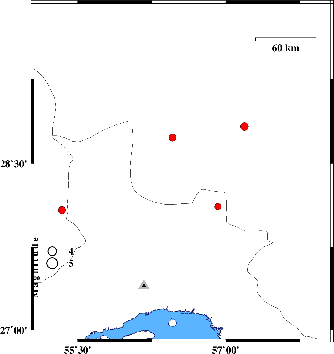 | 2007/06/22 | 22:07:33.4 | 01:37:33.4 | 27.8 | 57.02 | 14 | ML:3 | 47 km North-West of Dehbarez, Hormozgan Province | ||