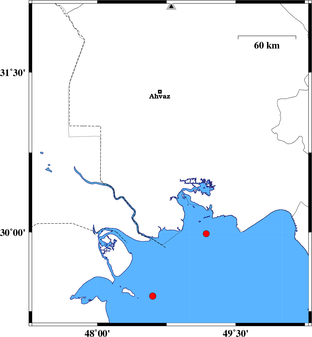 | 2007/05/24 | 16:51:52.8 | 20:21:52.8 | 30.64 | 48.79 | 18 | ML:3 | 14 km East of Shadegan, Khoozestan Province | ||