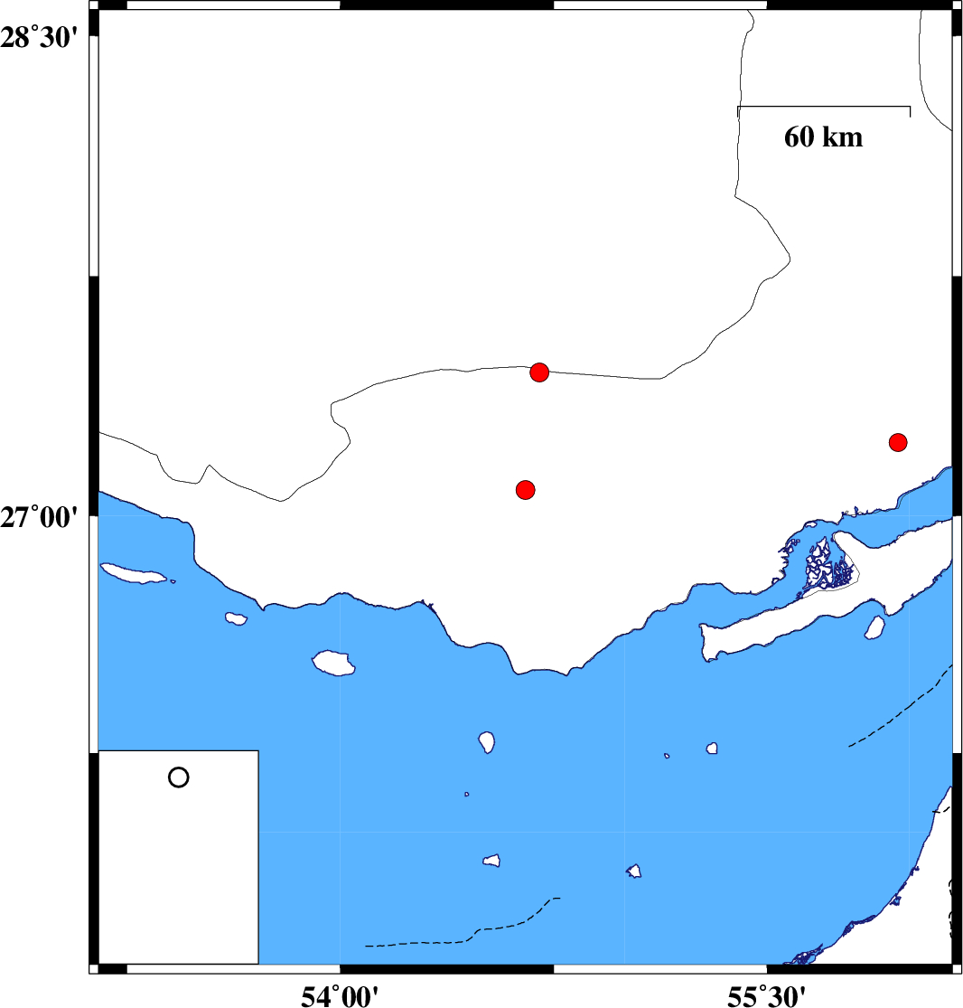 | 2007/05/24 | 00:50:42.3 | 04:20:42.3 | 27.23 | 55.96 | 40 | ML:2.8 | 32 km West of Bandar-e abbas, Hormozgan Province | ||