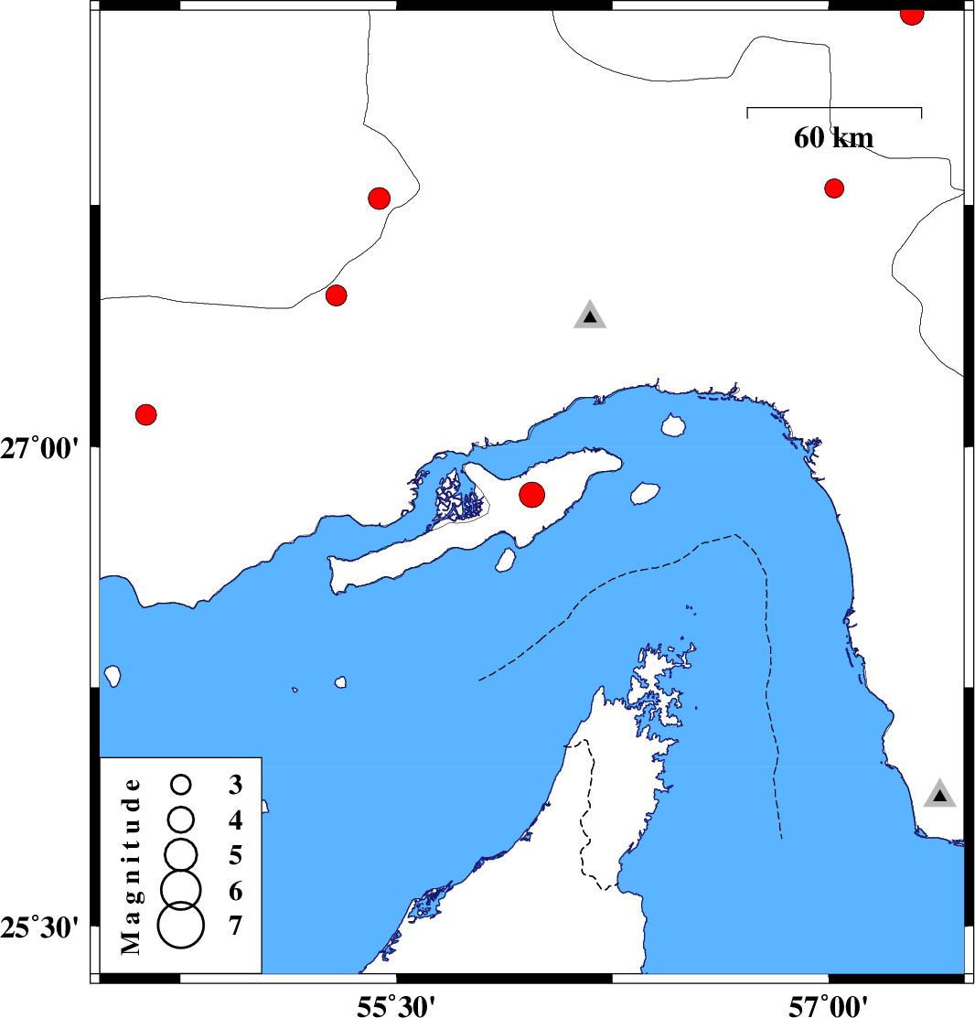 | 2007/06/27 | 19:08:16.9 | 22:38:16.9 | 26.85 | 55.97 | 17 | ML:3.9 | Persian Gulf, 31 km South-West of Qeshm | ||