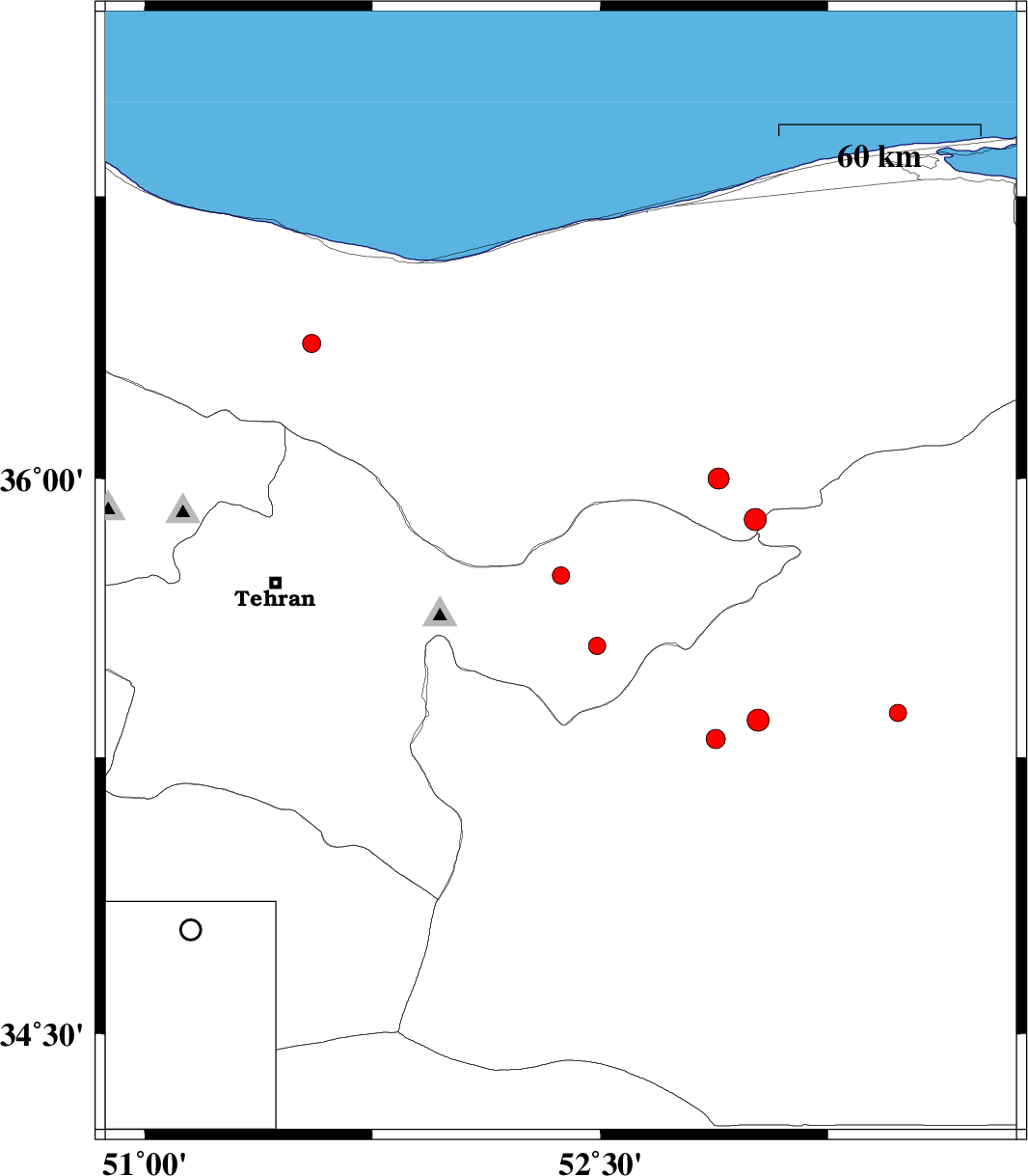 | 2007/04/29 | 05:36:09.7 | 09:06:09.7 | 35.74 | 52.37 | 6 | ML:2.6 | 27 km East of Damavand, Tehran Province | ||