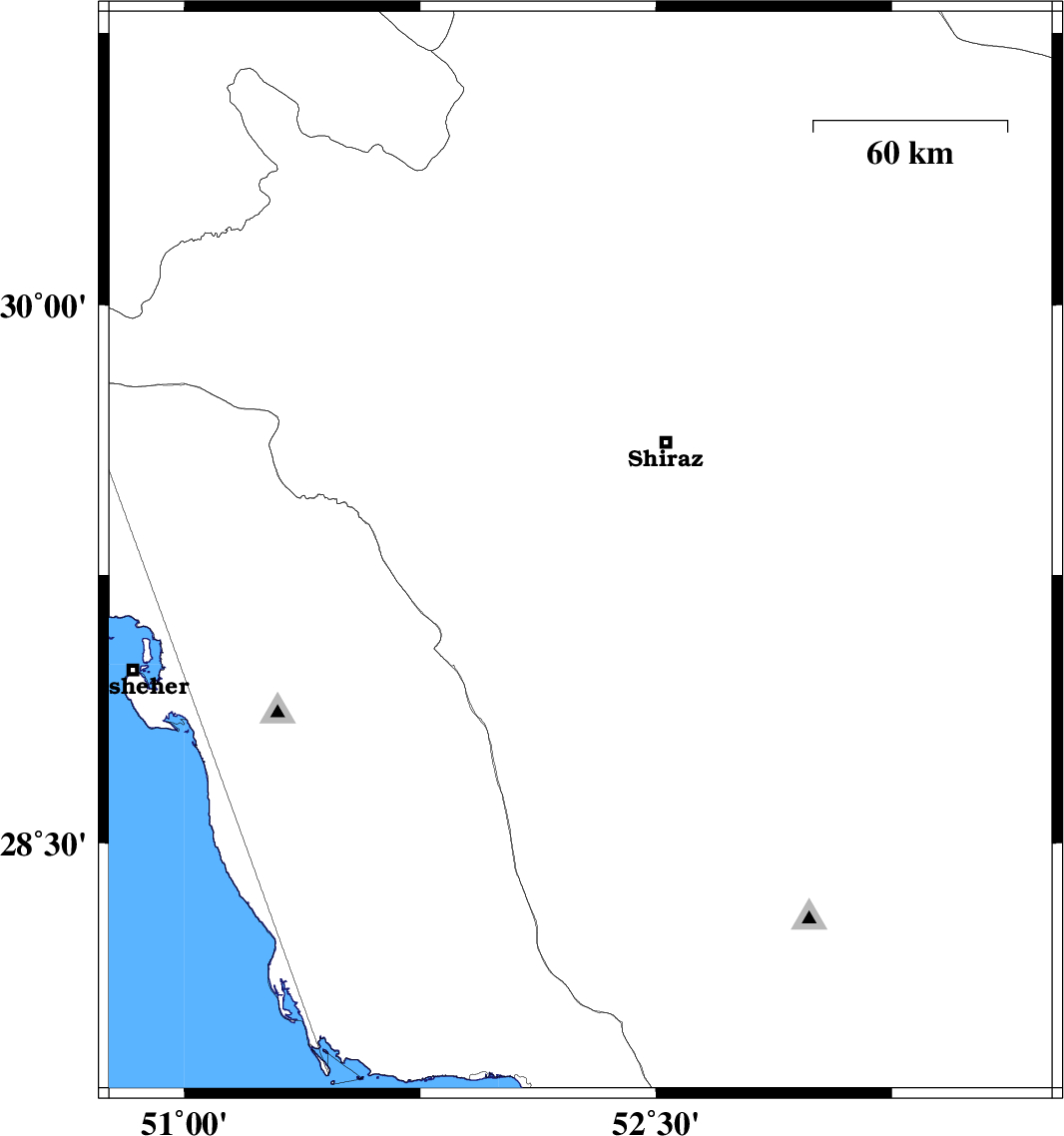 | 2007/05/29 | 06:18:57.2 | 09:48:57.2 | 29.31 | 52.26 | 46 | ML:4 | 43 km South-West of Shiraz, Fars Province | ||