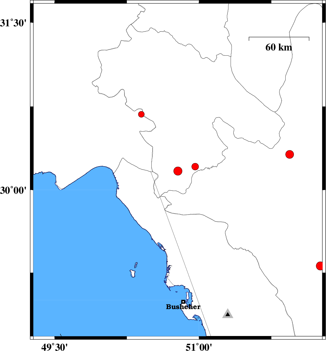 | 2007/05/24 | 20:16:29.3 | 23:46:29.3 | 30.68 | 50.4 | 15 | ML:2.8 | 17 km East of Behbahan, Khoozestan Province |