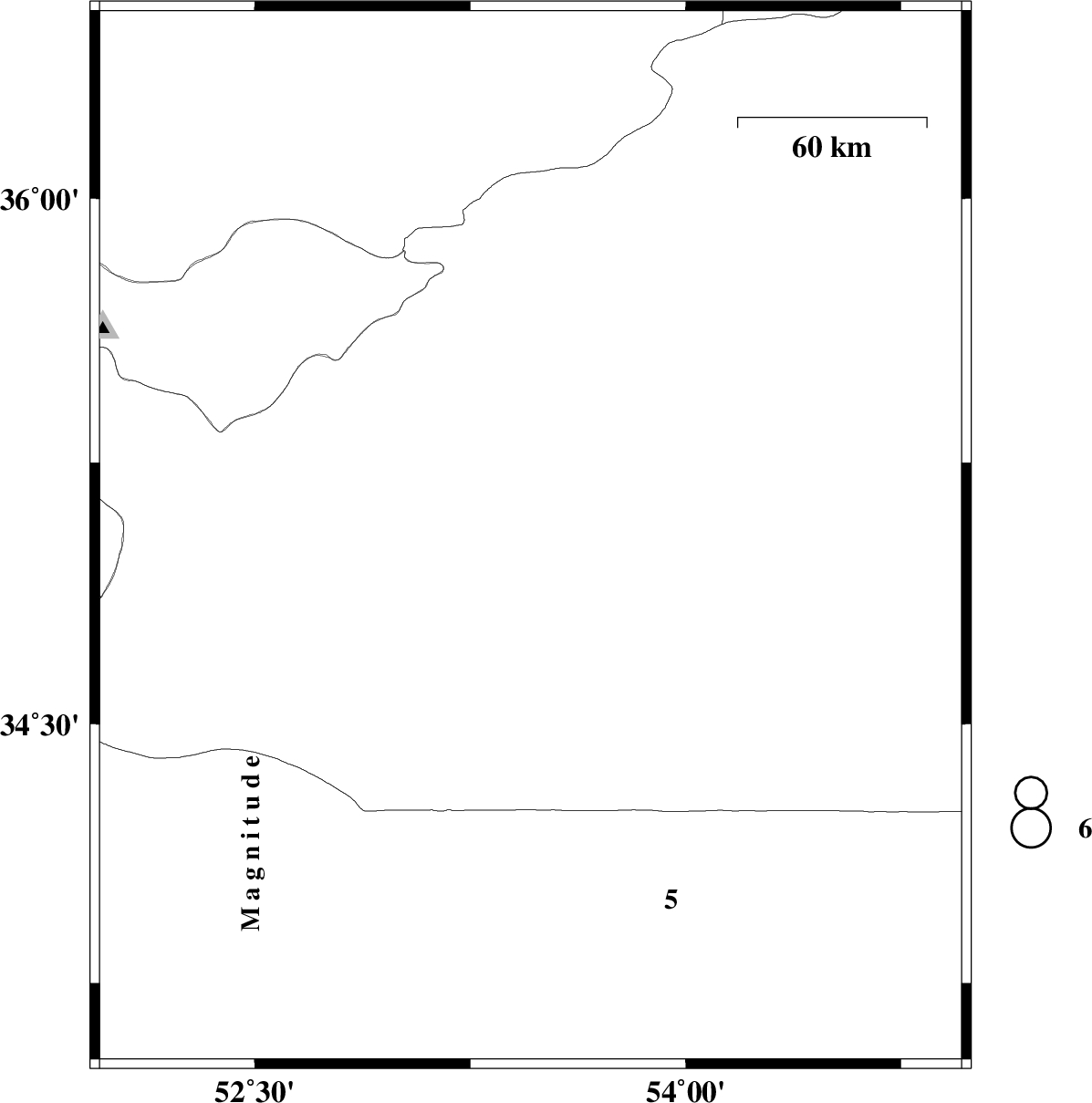 | 2007/08/27 | 02:50:31.4 | 06:20:31.4 | 36.32 | 53.78 | 14 | ML:2.7 | 46 km South-East of Behshahr, Mazandaran Province |