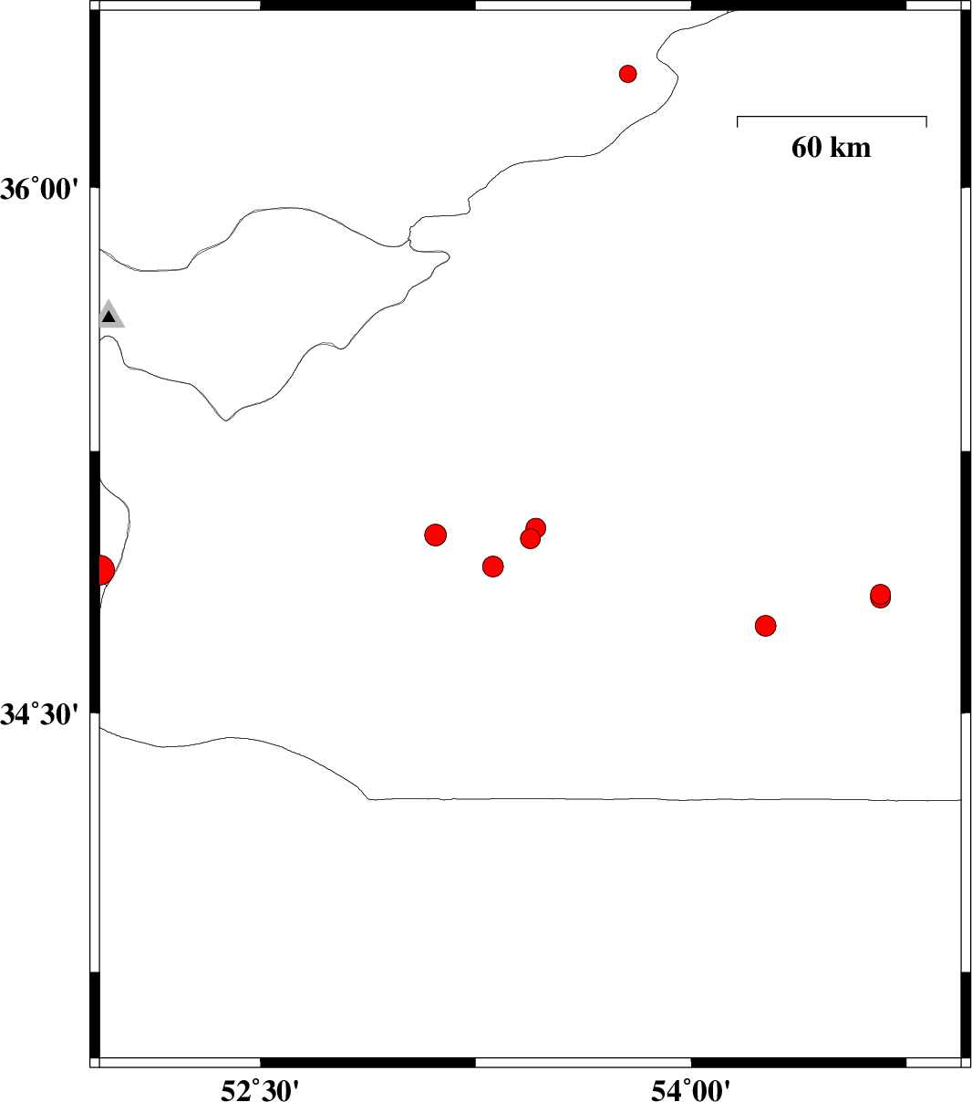 | 2007/09/04 | 00:47:02.4 | 04:17:02.4 | 34.92 | 53.31 | 14 | ML:3.2 | 72 km South of Semnan, Semnan Province | ||