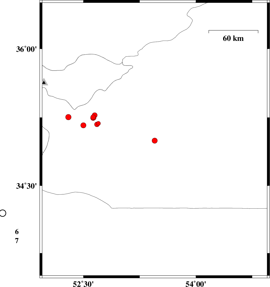 | 2007/09/05 | 17:52:35.7 | 21:22:35.7 | 34.94 | 53.51 | 14 | ML:2.6 | 70 km South-East of Semnan, Semnan Province | ||